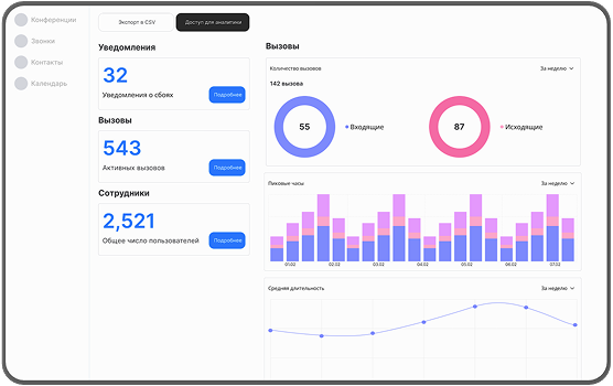 Панель управления и АналитикаЖурнал звонков, время ответа, свободные операторы, клиентов в ожидании, управление очередями и операторами, отслеживание статусов операторов и многое другое. Своя аналитика для каждой роли.